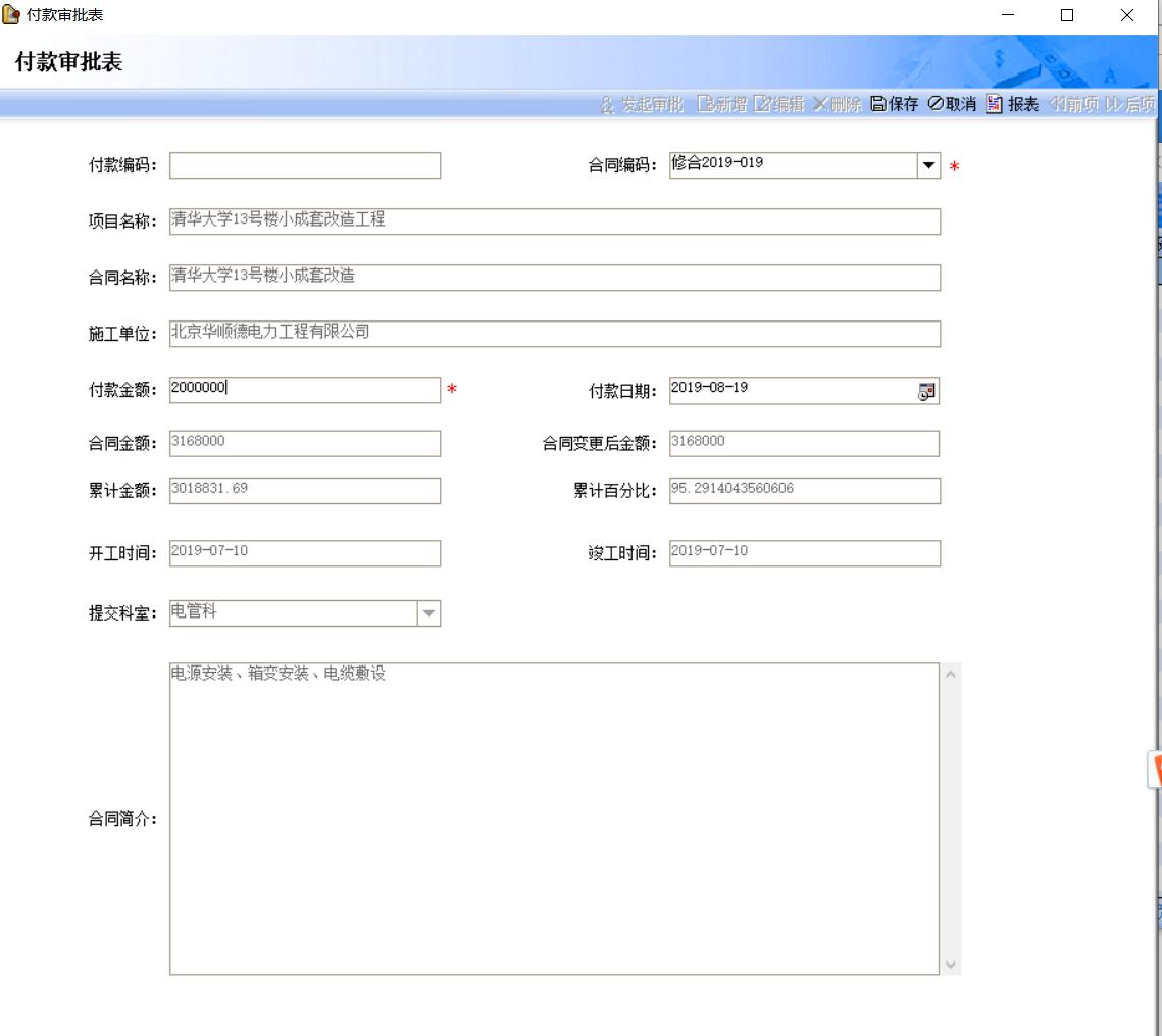 各科室输入合同付?g��u)Ƒ֮�批表�Q�发起审�Ҏ(gu��)���E�。付?g��u)Ƒ֮�批表包括��目名称、合同名�U�、施工单位、篏计付?g��u)��N��额等信息�Q�审批完成后生效�?/p>